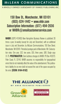 150 Dow St., Manchester, NH 03101 (603) 624-1442 • www.nhbr.com Subscription Information: (877) 494-2036 or NHBR@emailcustomerservice.com NHBR (USPS 413430) New Hampshire Business Review is published 26 times a year, bi-weekly (except for July and December), with an additional issue in July and December, by McLean Communications, 150 Dow Street, Manchester, NH 03101. Periodical postage paid at Manchester, NH. Subscription rates: One year, $32, two years, $55, three years, $80. Single copy $1.75. POSTMASTER: Send address changes to NHBR, PO Box 433273, Palm Coast, FL 32143. NHBR assumes no responsibility for typographical errors that do not materially affect the value of the advertisement. This publication’s liability for an error shall not exceed the cost of the space occupied by the error. (ISSN: 0164-8152)