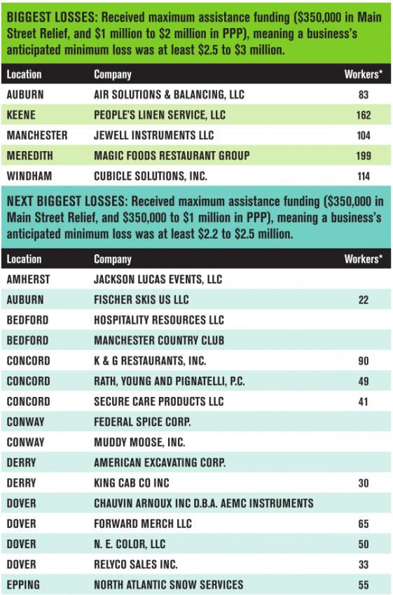 NH Business Review looked at companies that benefited from both programs the most — those that got the maximum Main Street loan of $350,000 and which received at least that much in PPP money.