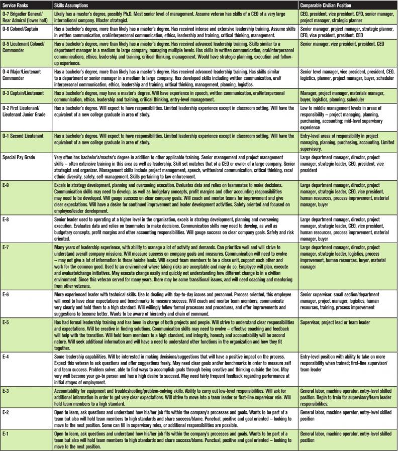 This chart from Eversource Energy’s Veterans Business Resource Group provides a list of likely skills veterans develop at each military service rank and the comparable civilian position in regard to entry-level, management and leadership qualifications.