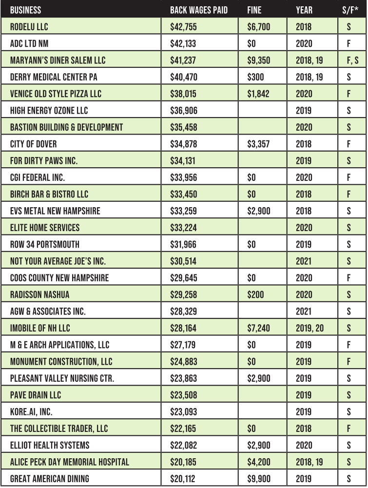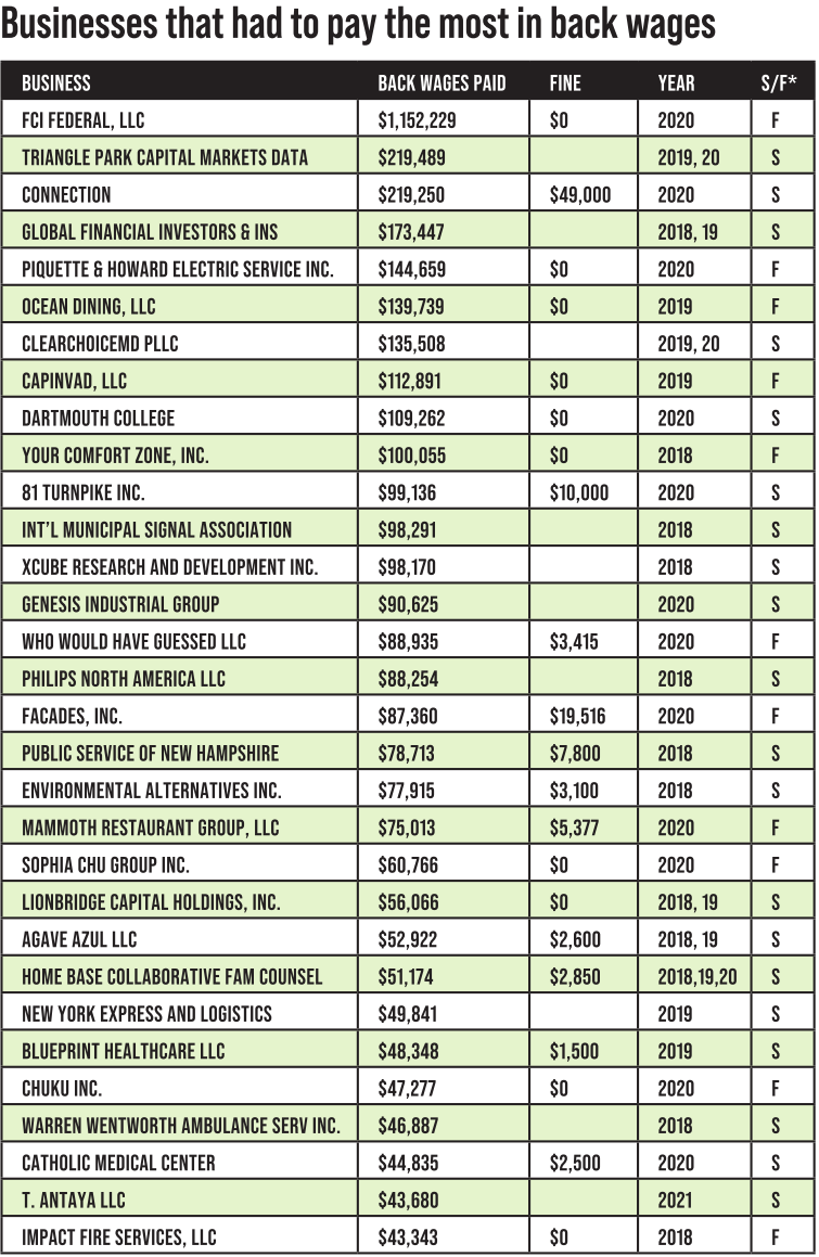 The state DOL issued more than $1.5 million in penalties during the last three years (the feds, over $250,000 in New Hampshire), but the above categories usually didn’t result in wage adjustments.