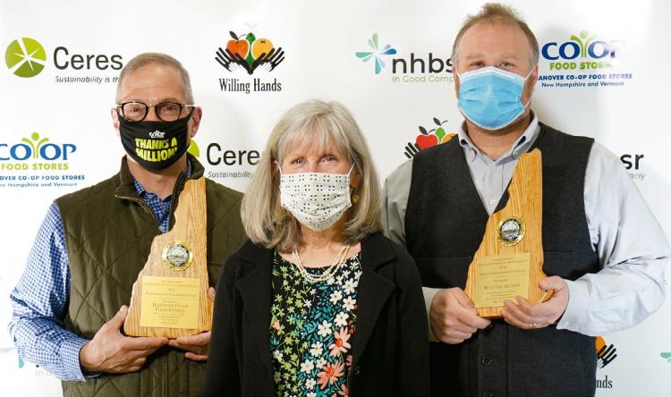 New Hampshire Businesses for Social Responsibility presented the Hanover Co-Op Food Stores and Willing Hands with its Partnership for Innovation Award for their effort to divert food from landfills and distribute it to some 80 food banks. In addition, Dartmouth-Hitchcock Health was honored with the organization’s Cornerstone Award, which goes to an organization that ‘exemplifies the concepts of corporate social responsibility.’ Shown here are Paul Guidone, left, general manager of Hanover Co-op Food Stores; Michelle Veasey, center, executive director of NHBSR; and Gabe Zoerheide, director of Willing Hands.