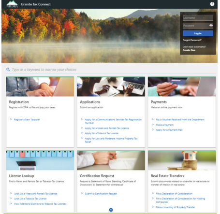 Granite Tax Connect allows taxpayers, tax professionals and DRA customers to manage multiple accounts, file and amend returns, view balances, schedule payments, view correspondence, register new accounts, check the status of returns and payments, request refunds and credits, and update information.