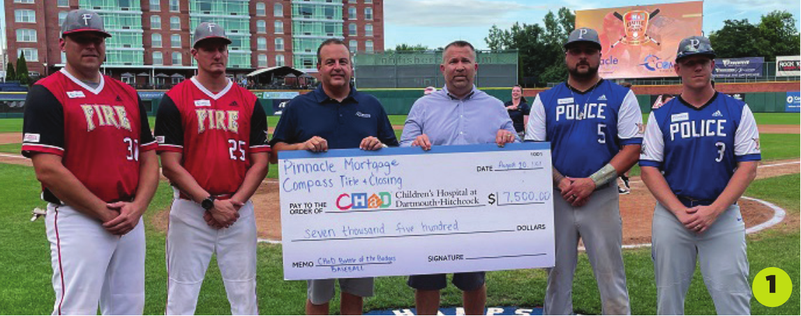 1. Kurt Strandson, third from right, and Ryan Mullholland, third from left, of Pinnacle Mortgage and Compass Title & Closings, respectively, join CHaD Battle of the Badges captains and coaches to present a $7,500 check to the Children’s Hospital at Dartmouth at the Battle of the Badges Baseball Classic. From left are Team Fire’s Adam Kobeski and Jon Lopez, and Team Police’s Chris Heney and Steve Case. Team Police won the game, 11-5, which was played at Delta Dental Stadium in Manchester, and the event raised over $111,000.