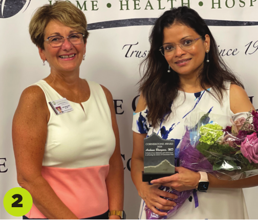2. Julie Reynolds, left, president and CEO of Cornerstone VNA, Rochester, presented the 2020 Cornerstone Award to Dr. Archana Bhargava. Dr. Bhargava, medical director of Frisbie Memorial Hospital’s Center for Cancer Care and Hematology and a longtime Cornerstone VNA board member, was honored “for her important contributions to our organization and the community,” said Reynolds. Also at the event, the 2021 Cornerstone Award was given to four community mask-maker groups: Tara Estates Mask Brigade, Face Mask Makers, Seacoast Mask Makers and Friends of Farmington.