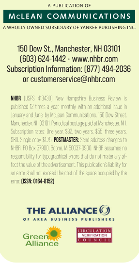 NHBR (USPS 413430) New Hampshire Business Review is published 12 times a year, monthly, with an additional issue in January and June, by McLean Communications, 150 Dow Street, Manchester, NH 03101. Periodical postage paid at Manchester, NH. Subscription rates: One year, $32, two years, $55, three years, $80. Single copy $1.75. POSTMASTER: Send address changes to NHBR, PO Box 37900, Boone, IA 50037-0900. NHBR assumes no responsibility for typographical errors that do not materially affect the value of the advertisement. This publication’s liability for an error shall not exceed the cost of the space occupied by the error. (ISSN: 0164-8152)