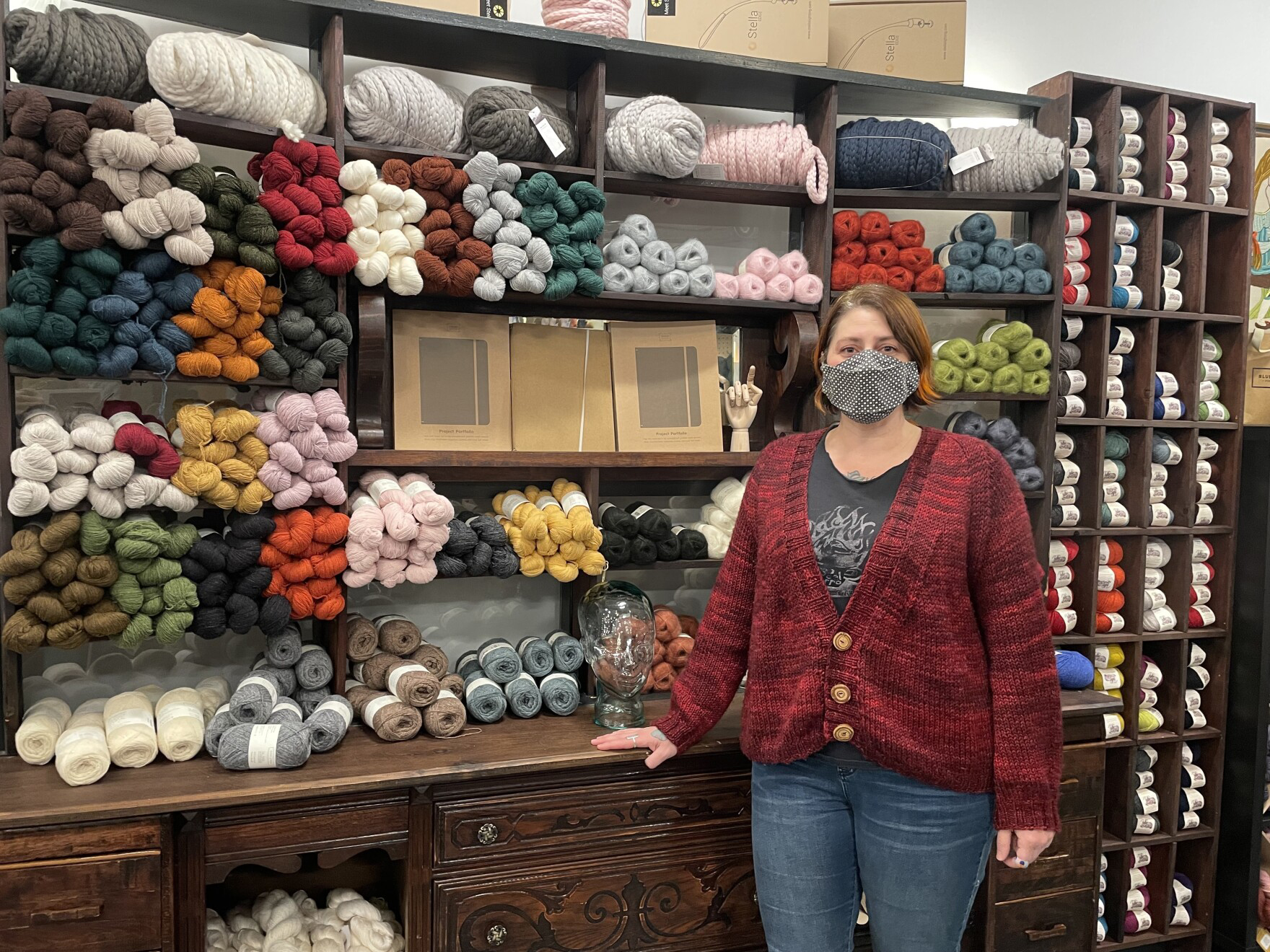 Nearby, Scratch Supply Company Co-Owner Jessica Giordani is preparing for another busy day. Her store sells yarn, and she says knitting season has arrived. But her customers don’t always visit the store in person.