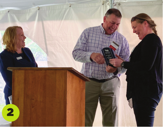 Winners were: Jon Hunt, executive director of Whaleback Mountain; King Arthur Baking Company; Norwich Bookstore; Meagan Henry, program coordinator at the Lebanon Parks, Recreation and Arts department; Mac’s Maple; SILO Distillery; Alice Peck Day Memorial Hospital; Upper Valley Haven; and Jennifer Karr, master trainer at the River Valley Club. Pictured here: Travis Singer of Liberty Utilities presents Mac’s Maple of Plainfield with Retail Business of the Year Award.