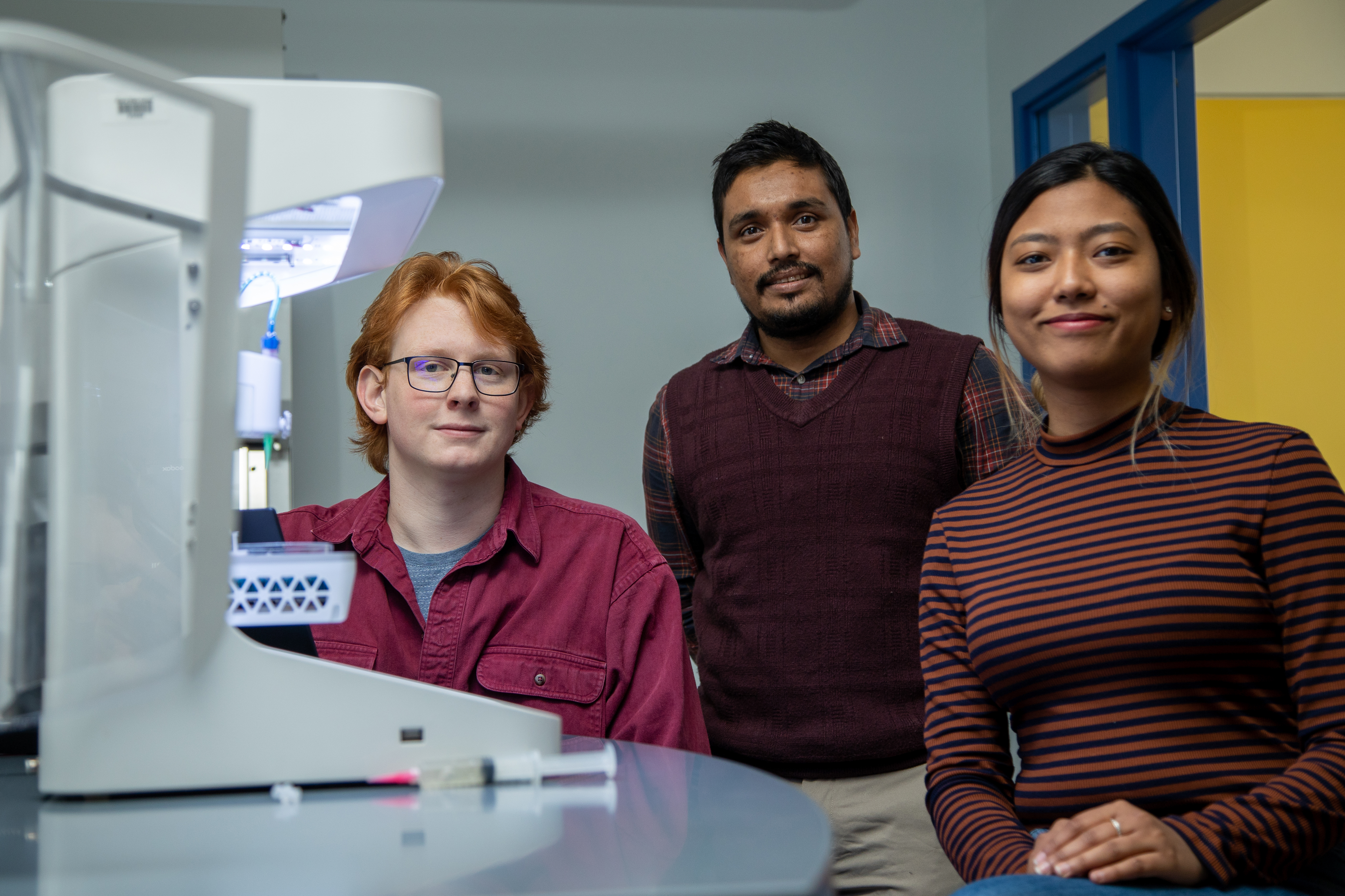 Nelson acknowledged that his emphasis remains on material testing to discover a mixture that is easily printable, has positive effects on living cells and that can structurally support itself in larger scaffolds, or organs. Testing cell cultures is Tuladhar’s area of research focus.