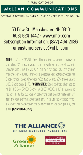 NHBR (USPS 413430) New Hampshire Business Review is published 12 times a year, monthly, with an additional issue in January and June, by McLean Communications, 150 Dow Street, Manchester, NH 03101. Periodical postage paid at Manchester, NH. Subscription rates: One year, $32, two years, $55, three years, $80. Single copy $1.75. POSTMASTER: Send address changes to NHBR, PO Box 37900, Boone, IA 50037-0900. NHBR assumes no responsibility for typographical errors that do not materially affect the value of the advertisement. This publication’s liability for an error shall not exceed the cost of the space occupied by the error. (ISSN: 0164-8152)