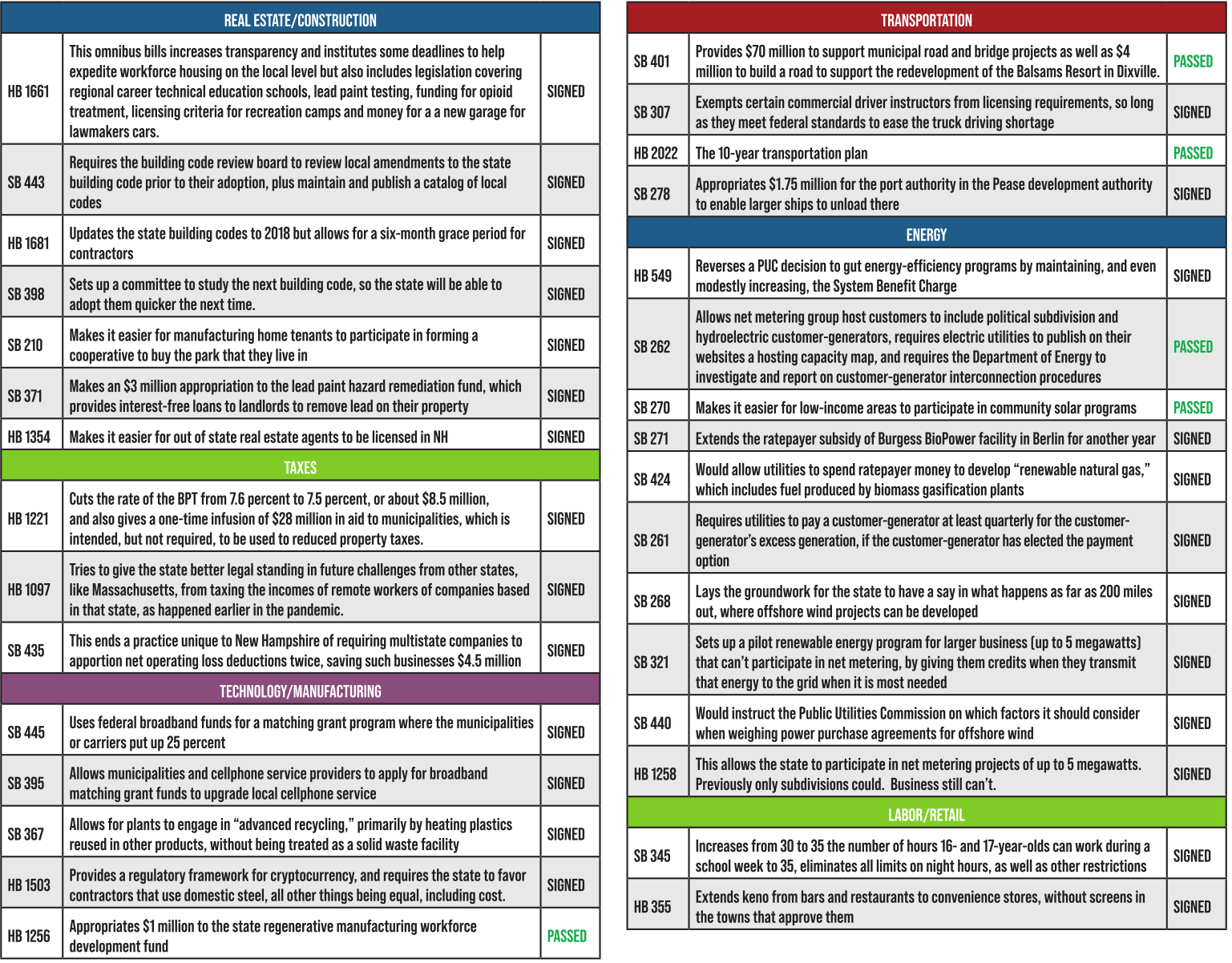 When it comes to commercial construction, perhaps the most important bill was SB 401, which spends some $70 million in state surplus money on municipal bridges ($36 million) and roads ($30 million), with an additional $4.1 million for the road needed to renovate The Balsams resort in Dixville.