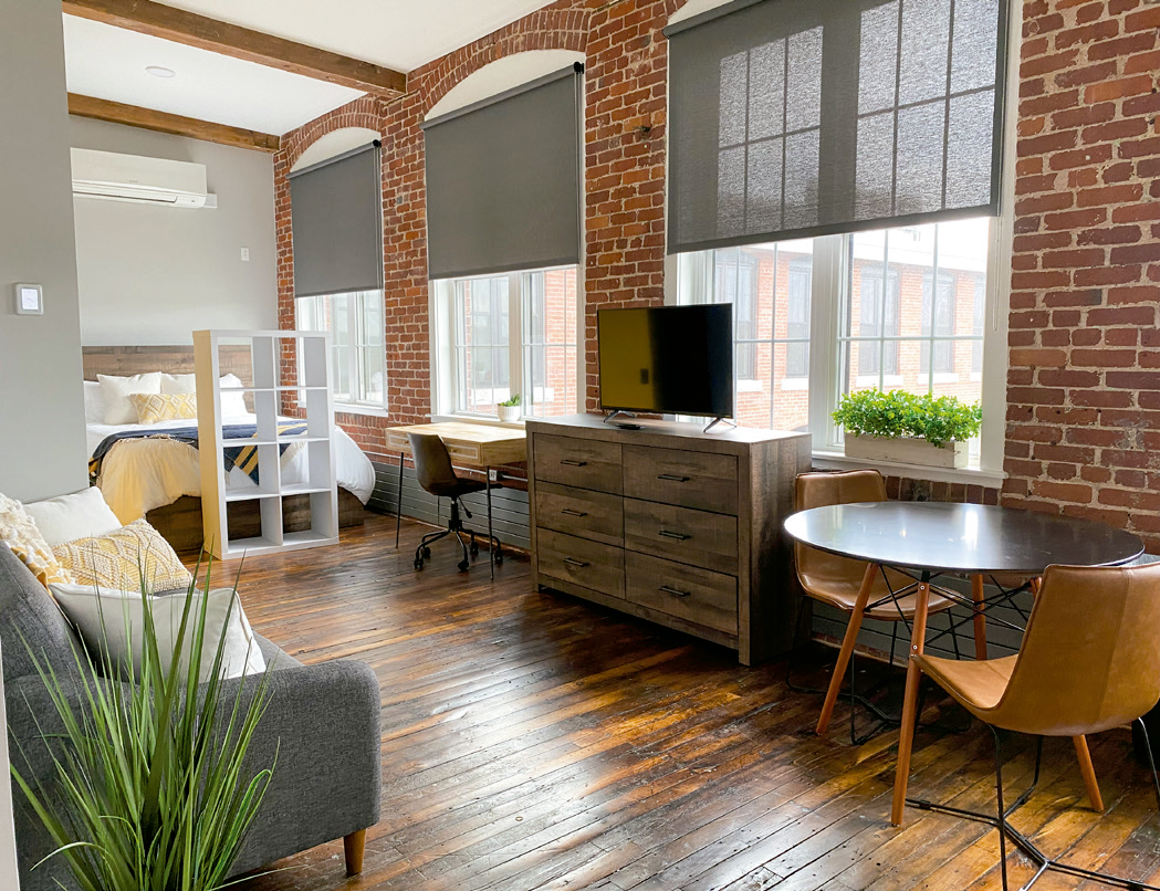 Adam Wagner, owner of Market Square Architects in Portsmouth, played an instrumental role to help Hitchcock transform her vision into a dynamic design that incorporates the mill’s rustic red brick walls and timber frames in the building’s open-air studio apartments. Orbit Group with visiting designers created the furnished Airbnb units so they will appeal to the targeted demographic of artists and gig economy workers.