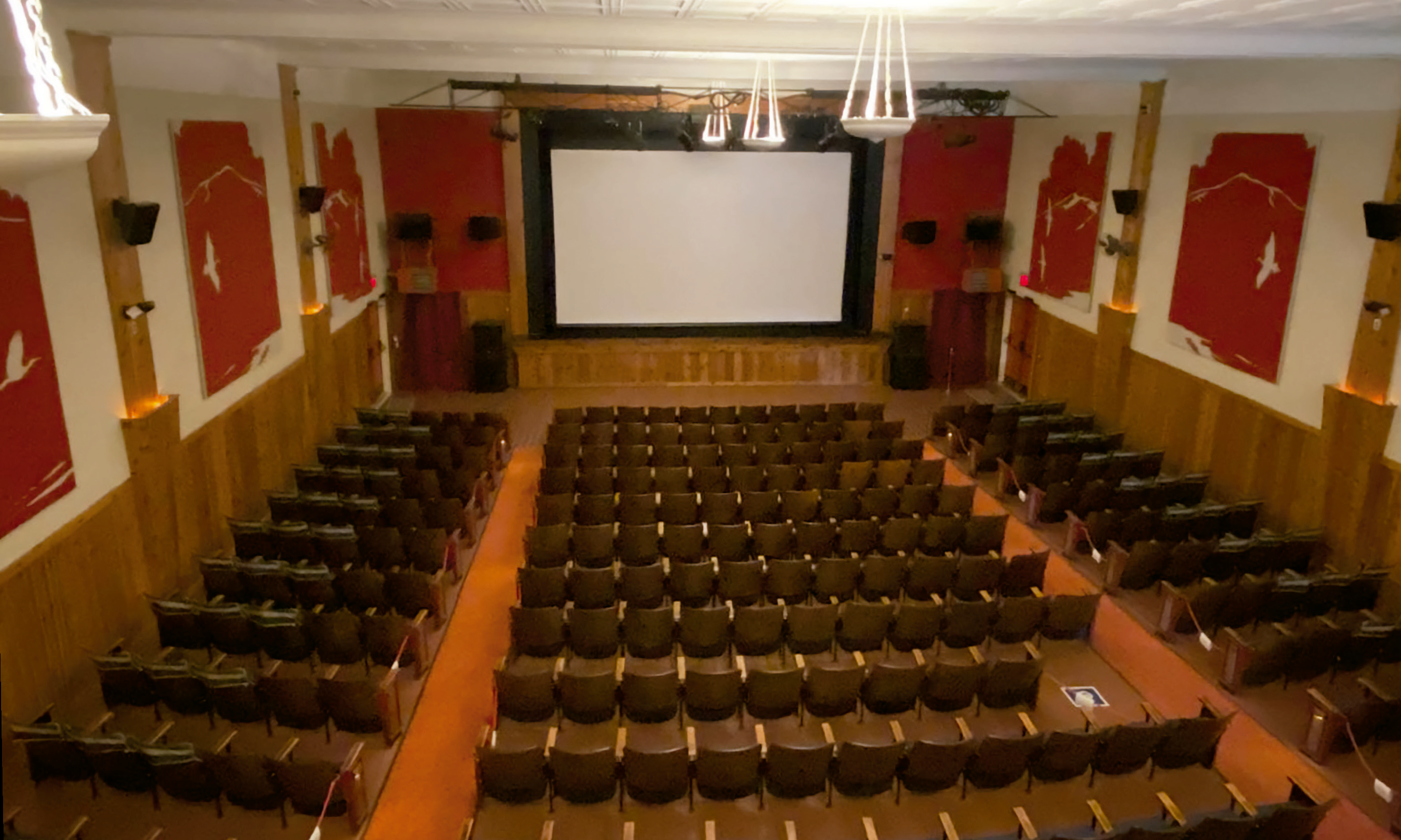 In a tour of the theater, the director pointed out the original metal seats, which had been reupholstered, and the tin ceiling, common in the day for being fireproof. Care had to be taken when drilling holes in the tin to install a sprinkler system. The end seat in each row features a metal art deco line design.