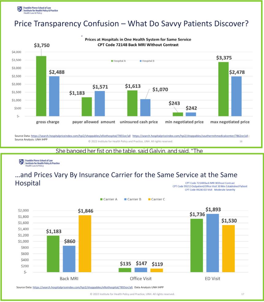 Those costs vary widely. In one study by the Institute of Public Policy and Health at UNH Law, the price discrepancy for the same service — a back MRI with contrast dye — differed by $2,200 depending on where it is performed. But it also varied by $1,000 even at the same hospital, depending on what health plan you have.