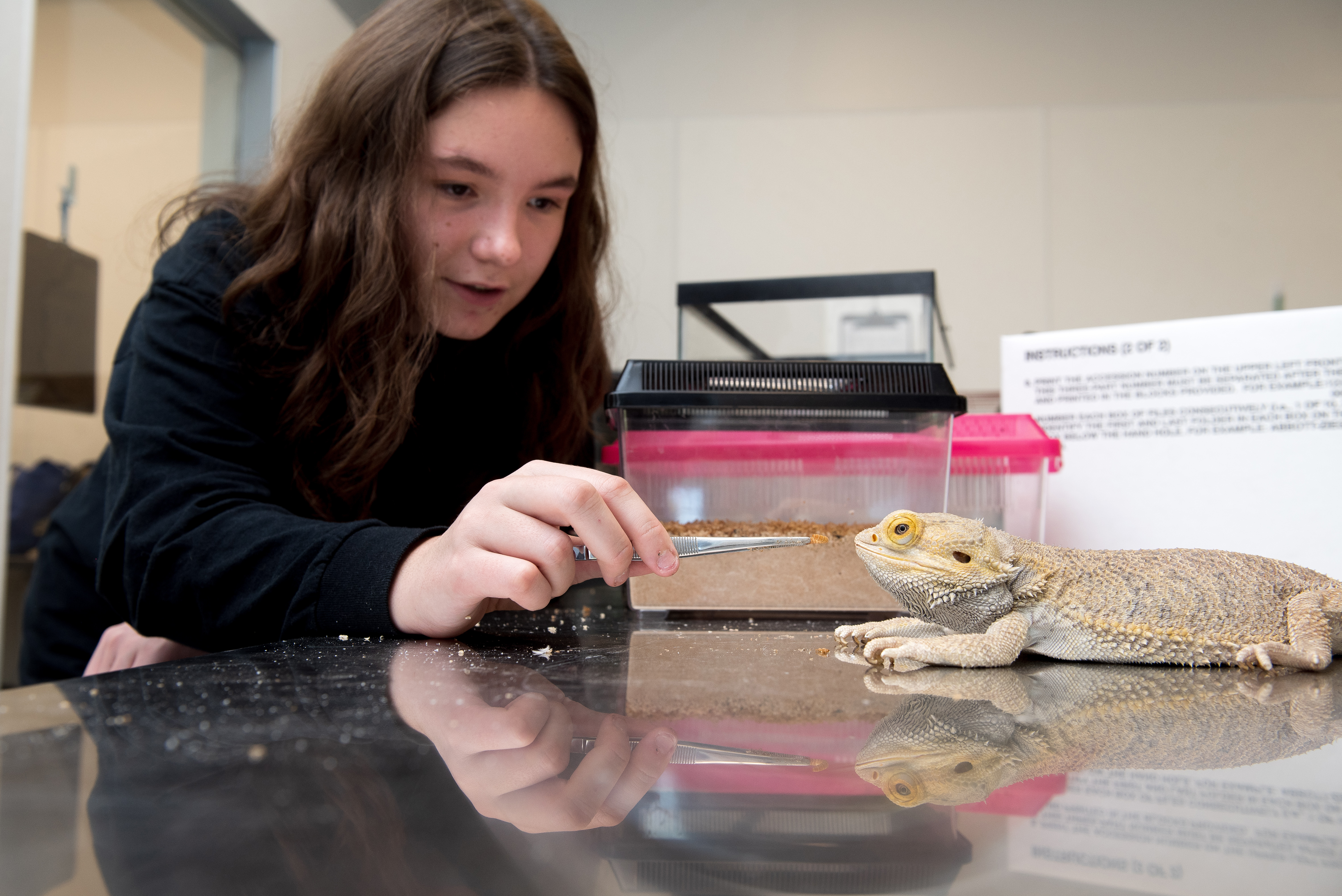 Allison Freeman, 16, a junior at Dover High School, gives bearded dragon Dexter his breakfast as part of the animal science program. (Photo by Kate Brindley Photography) Towards the end of the school year, when the last Dover High School bell rang at 2:30 p.m., Amber Meader exited, like the other 1,500 students. She was a typical high school senior, but unlike most of her peers, once the school day ended, she headed to a job she loves and plans on pursuing as a career.