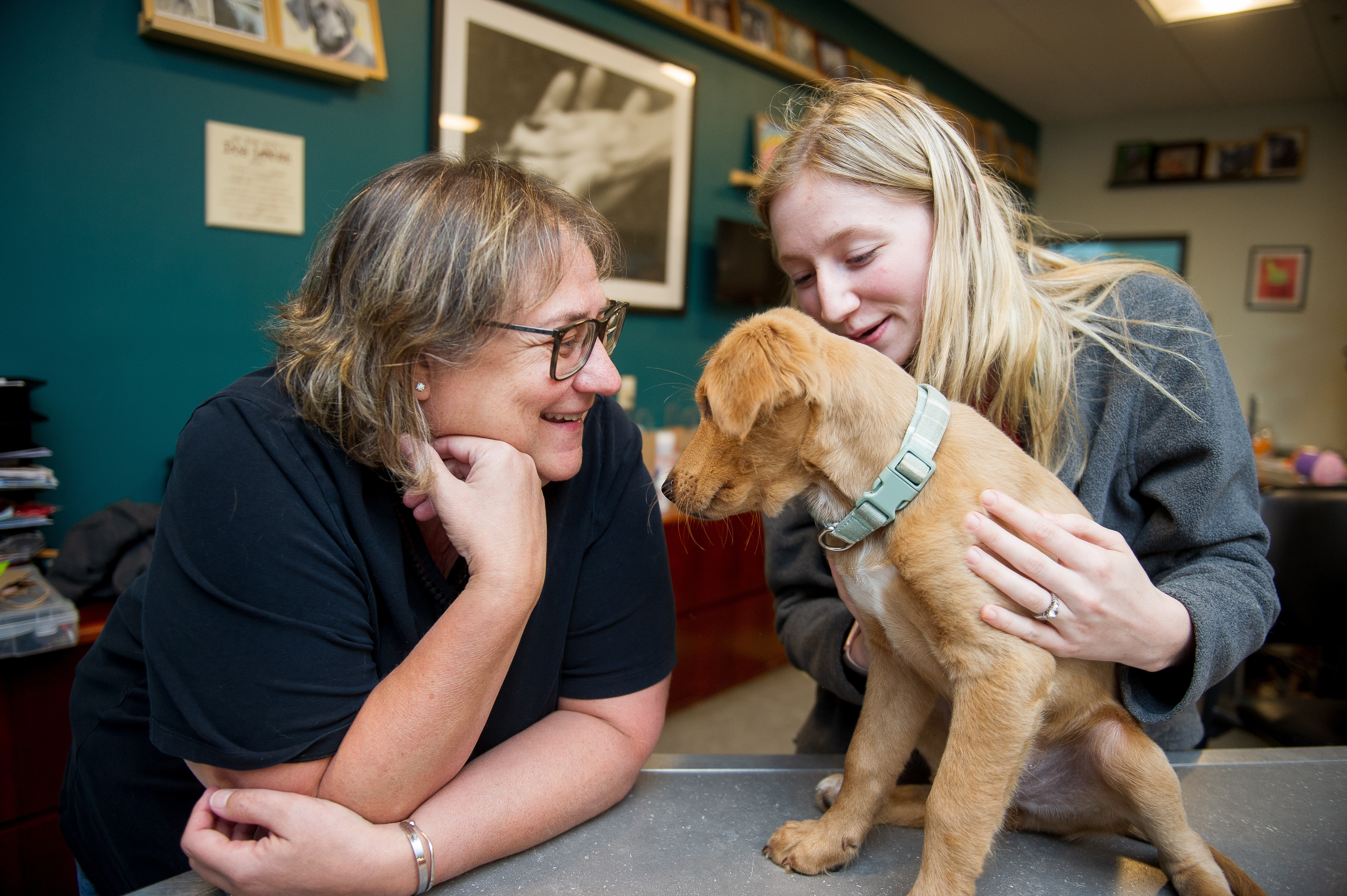 K9 Kaos owner Anne Nichols and Brittany Bonovich, employee and graduate of the animal science program, say hello to Beau, a regular of the shop. (Photo by Kate Brindley Photography)