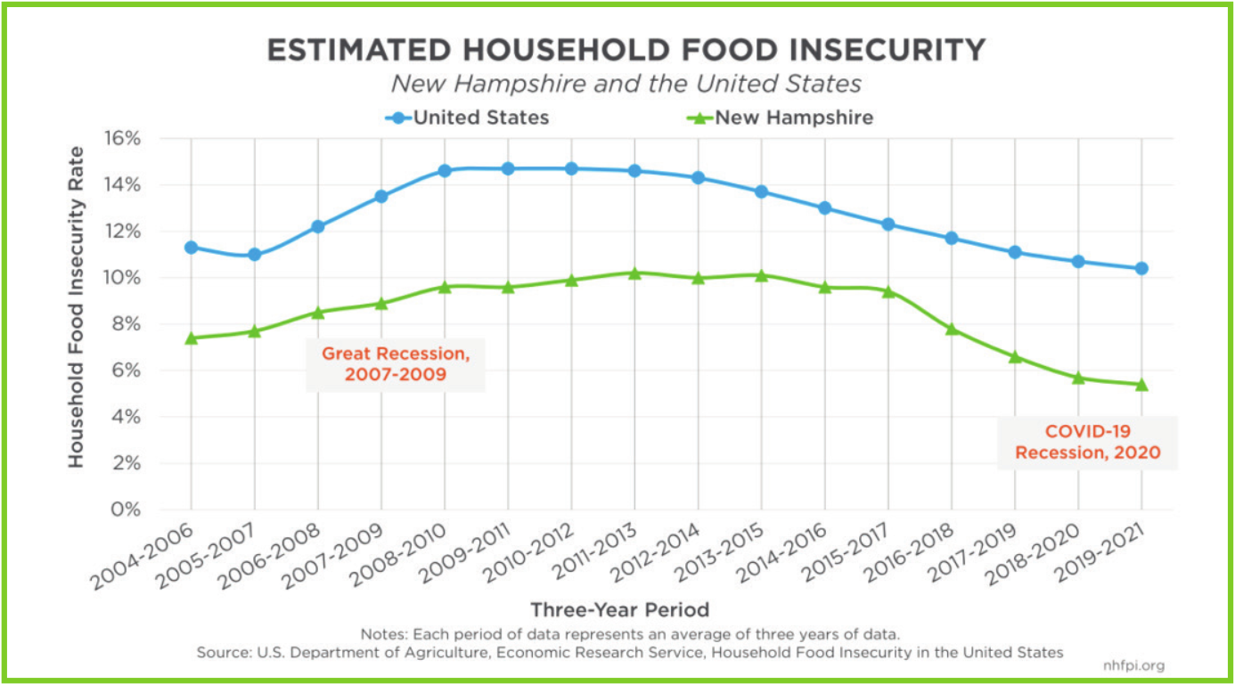 New data shows that food insecurity among New Hampshire households declined in the last three years, with federal assistance programs helping to offset the negative effects of economic upheavals caused by the Covid-19 pandemic.
