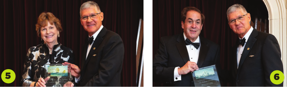 5-6. On Oct. 13, the U.S. Navy League Portsmouth Council honored U.S. Senator Jeanne Shaheen and Ken Solinsky at the Inaugural U.S. Navy Birthday Ball. Kevin Galeaz, president of the U.S. Navy League Portsmouth Council, awarded the Captain John Paul Jones Award for Leadership in Military or Civic Affairs to Senator Jeanne Shaheen and the James Hackett Award for Leadership in Industry to Ken Solinksy, who, now retired, was the founder of Insight Technology (acquired by L-3 Warrior Systems in 2013). Funds raised from the event were given to Swim With a Mission, a nonprofit that helps strengthen and support organizations that service, support and honor our veterans.