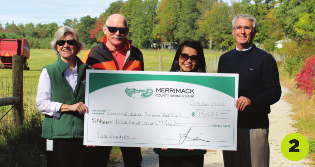 2. Merrimack County Savings Bank purchased $15,000 in tax credits through the NH Community Development Finance Authority to help fund Phase 4 of the Concord – Lake Sunapee Rail Trail (CLSRT), a 2.5-mile section from Fisherville Road to Carter Hill Road in Concord. From left: Linda Lorden, president of The Merrimack; Boyd Smith, CLSRT board member; Diana Johnson, VP marketing officer, The Merrimack; and Tim Blagden, CLSRT board president.