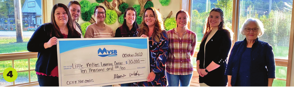 4. Little Antlers Learning Center, a child care center for children aged six weeks to six years old from low- to moderate-income households, recently opened its doors in Plymouth with the help of $10,000 in tax credits from Meredith Village Savings Bank (MVSB). Pictured here: Martha Clifford, MVSB branch and business development manager (left); Kayla Champagne, MVSB branch services supervisor (second from right); with Alison Murphy, Little Antlers Learning Center director and her staff.