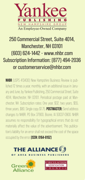 NHBR (USPS 413430) New Hampshire Business Review is published 12 times a year, monthly, with an additional issue in January and June, by Yankee Publishing, 250 Commercial Street, Suite 4014, Manchester, NH 03101. Periodical postage paid at Manchester, NH. Subscription rates: One year, $32, two years, $55, three years, $80. Single copy $1.75. POSTMASTER: Send address changes to NHBR, PO Box 37900, Boone, IA 50037-0900. NHBR assumes no responsibility for typographical errors that do not materially affect the value of the advertisement. This publication’s liability for an error shall not exceed the cost of the space occupied by the error. (ISSN: 0164-8152)