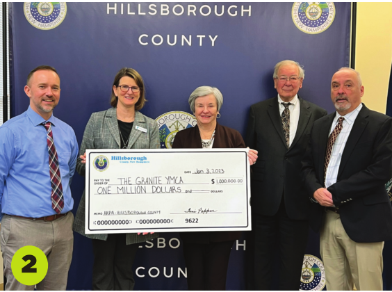 2. The Granite YMCA was recently awarded $1 million in grant funding by Hillsborough County as part of the American Rescue Plan Act (ARPA) funding for the Hillsborough County Board of Commissioners to provide for local nonprofits. From left to right: Ryan Gadow, COO of The Granite YMCA; Michele Sheppard, CEO of The Granite YMCA; Toni Pappas, Hillsborough County Commissioner; Robert Rowe, Hillsborough County Commissioner; and Michael Soucy, Hillsborough County Commissioner.