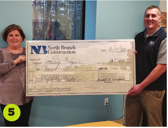 5. North Branch Construction has donated the proceeds from the firm’s annual Safety Fine Program to Community Bridges in Concord and Lakes Region Community Developers in Laconia. In 2022, the Safety Fine Program proceeds totaled nearly $4,000, resulting in a $2,000 donation to each organization. Pictured: Community Bridges President and CEO Ann Potoczak and North Branch Construction President Joseph Campbell.