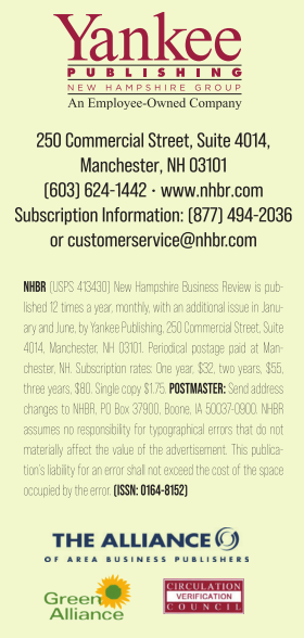 NHBR (USPS 413430) New Hampshire Business Review is published 12 times a year, monthly, with an additional issue in January and June, by Yankee Publishing, 250 Commercial Street, Suite 4014, Manchester, NH 03101. Periodical postage paid at Manchester, NH. Subscription rates: One year, $32, two years, $55, three years, $80. Single copy $1.75. POSTMASTER: Send address changes to NHBR, PO Box 37900, Boone, IA 50037-0900. NHBR assumes no responsibility for typographical errors that do not materially affect the value of the advertisement. This publication’s liability for an error shall not exceed the cost of the space occupied by the error. (ISSN: 0164-8152)