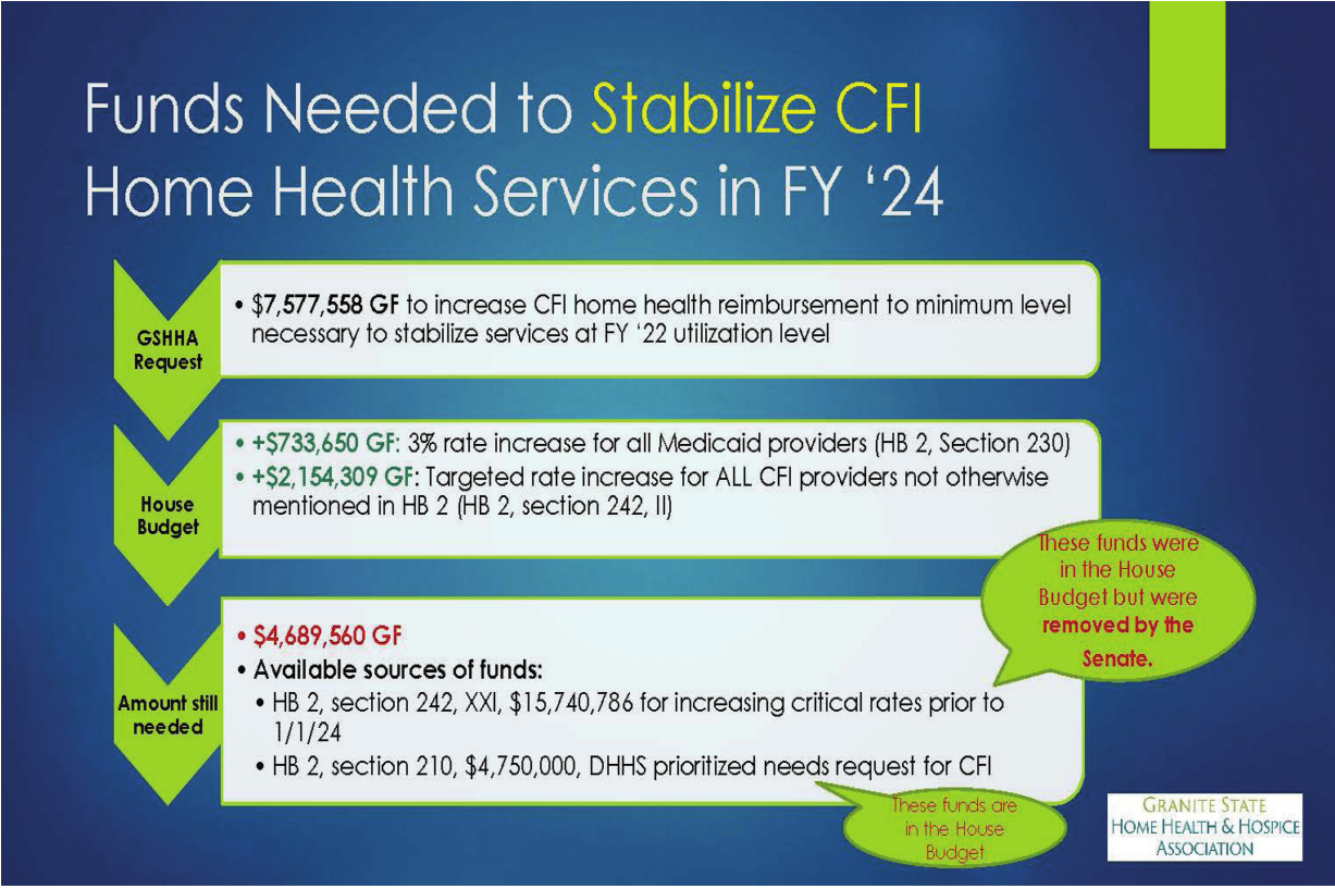 The NH Fiscal Policy Institute has found that New Hampshire’s CFI program has had a structural deficit of $153 million from fiscal years 2011 to 2021. Because of that, providers cannot recruit and retain workers and cover costs. A lack of workforce means more people are going without care and are either stuck in a hospital bed (if there is one available) or must go to a nursing home, which not only costs more but nursing homes face a worker shortage and capacity issues as well.