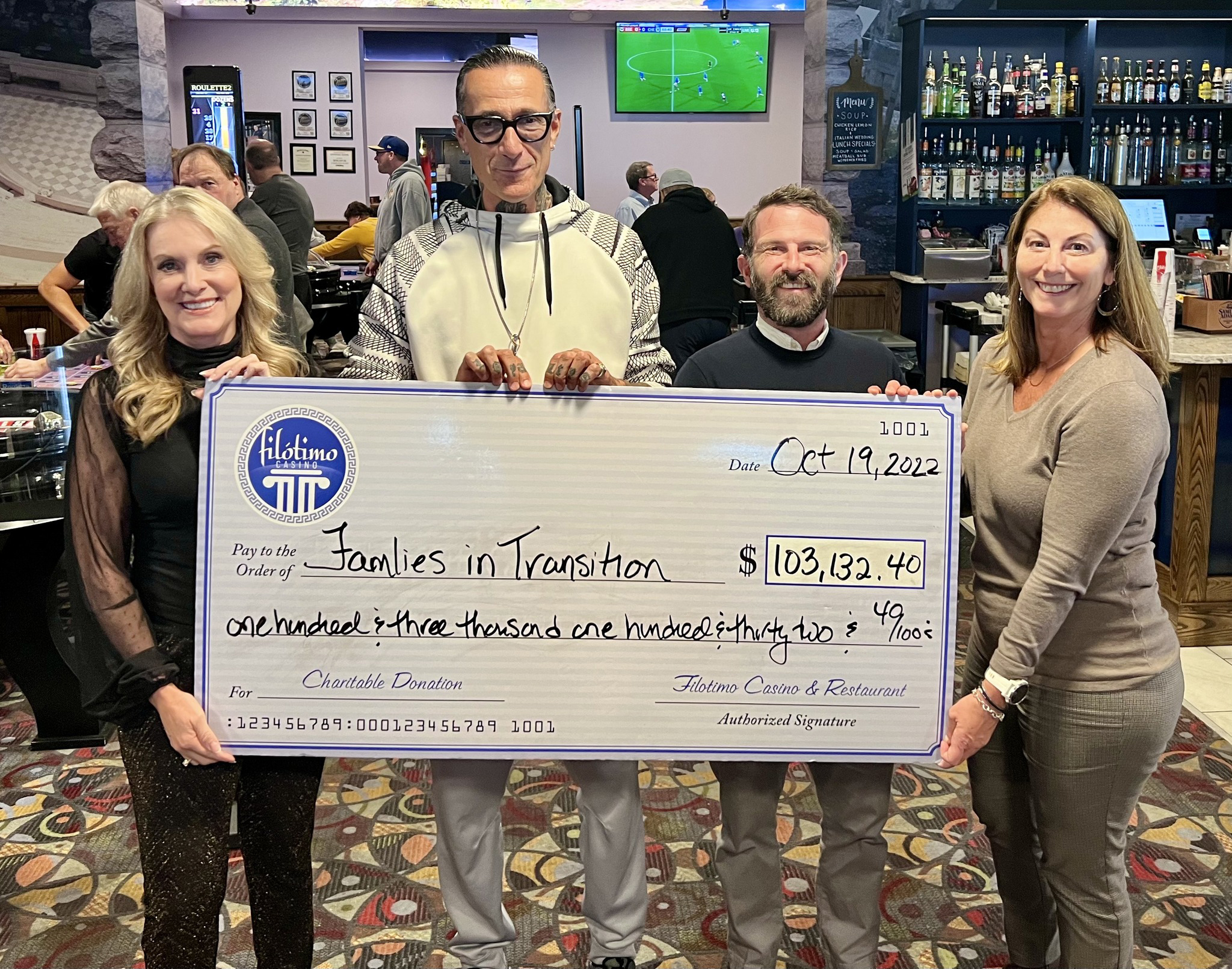 Tiffany Eddy, left, who works with The Anagnost Companies and Filotimo Casino, shown last October presenting a check for over $100,000 to Families in Transition CEO Maria Devlin, at right.