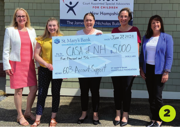 2. St. Mary’s Bank has awarded $20,000 to four nonprofit organizations. Receiving $5,000 each in support of their missions were the NHSPCA, Court Appointed Special Advocates of New Hampshire, Society for the Protection of New Hampshire Forests, and NH Food Bank. From left to right: Liz Stodolski, SMB director of marketing; Kelsea Batchelder, SMB community and employee engagement specialist; Erica Thoits, CASA director of community relations; Tarah Bergeron, CASA development associate; and Pamela Roy, SMB chief people officer.