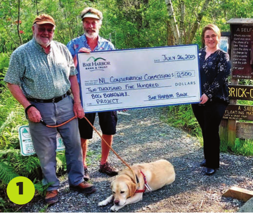 1. Bar Harbor Bank & Trust recently donated $2,500 to the New London Conservation Commission to support the organization’s project to improve the safety of the Philbrick-Cricenti Bog boardwalk. From left to right: Robert Brown, NLCC chair; Mark Vernon, NLCC trails steward; and Katherine Paine, Bar Harbor Bank & Trust assistant vice president branch relationship manager.