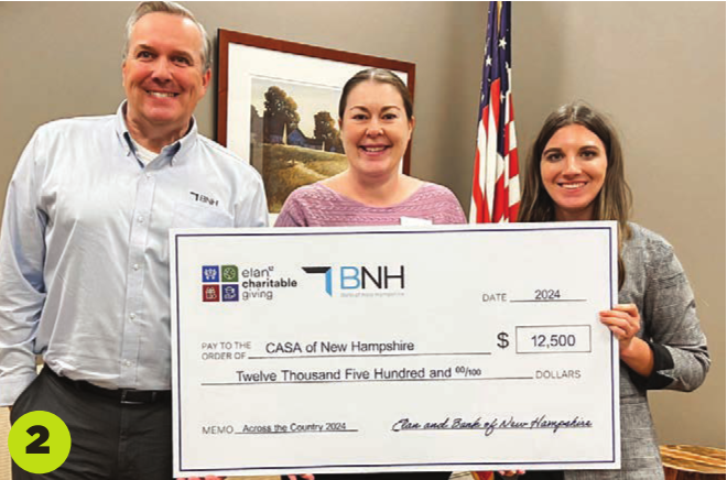 2. Elan Charitable Giving, the donation initiative of Elan Credit Card, donated $12,500 to Court Appointed Special Advocates of New Hampshire (CASA) as part of a $375,000 campaign benefiting 30 communities nationwide. Elan selected Bank of New Hampshire to be a campaign partner, which chose CASA New Hampshire to receive support. Eric Carter, left, and Julie Fenn, right, of BNH presented a check to CASA’s Erica Thoits, middle.