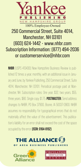 NHBR (USPS 413430) New Hampshire Business Review is published 12 times a year, monthly, with an additional issue in January and June, by Yankee Publishing, 250 Commercial Street, Suite 4014, Manchester, NH 03101. Periodical postage paid at Manchester, NH. Subscription rates: One year, $32, two years, $55, three years, $80. Single copy $1.75. POSTMASTER: Send address changes to NHBR, PO Box 37900, Boone, IA 50037-0900. NHBR assumes no responsibility for typographical errors that do not materially affect the value of the advertisement. This publication’s liability for an error shall not exceed the cost of the space occupied by the error. (ISSN: 0164-8152)