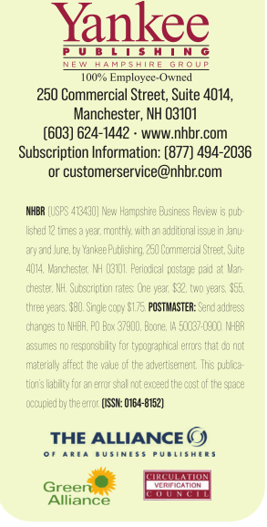 NHBR (USPS 413430) New Hampshire Business Review is published 12 times a year, monthly, with an additional issue in January and June, by Yankee Publishing, 250 Commercial Street, Suite 4014, Manchester, NH 03101. Periodical postage paid at Manchester, NH. Subscription rates: One year, $32, two years, $55, three years, $80. Single copy $1.75. POSTMASTER: Send address changes to NHBR, PO Box 37900, Boone, IA 50037-0900. NHBR assumes no responsibility for typographical errors that do not materially affect the value of the advertisement. This publication’s liability for an error shall not exceed the cost of the space occupied by the error. (ISSN: 0164-8152)