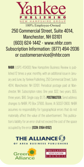 NHBR (USPS 413430) New Hampshire Business Review is published 12 times a year, monthly, with an additional issue in January and June, by Yankee Publishing, 250 Commercial Street, Suite 4014, Manchester, NH 03101. Periodical postage paid at Manchester, NH. Subscription rates: One year, $32, two years, $55, three years, $80. Single copy $1.75. POSTMASTER: Send address changes to NHBR, PO Box 37900, Boone, IA 50037-0900. NHBR assumes no responsibility for typographical errors that do not materially affect the value of the advertisement. This publication’s liability for an error shall not exceed the cost of the space occupied by the error. (ISSN: 0164-8152)