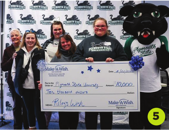 5. Make-A-Wish New Hampshire and Plymouth State University partnered to grant highschooler Riley Pinard’s wish of attending PSU. Make-A-Wish and University representatives, with “Pemi” the Panther, visited Pinard at PSU’s Lamson Library. She received a $10,000 scholarship, a reading chair for her future dorm room, Callahan AC & Heating Services’ gift of funds for books and dorm furnishings, and college merchandise. Pinard plans to major in English education at PSU in September after high school graduation.