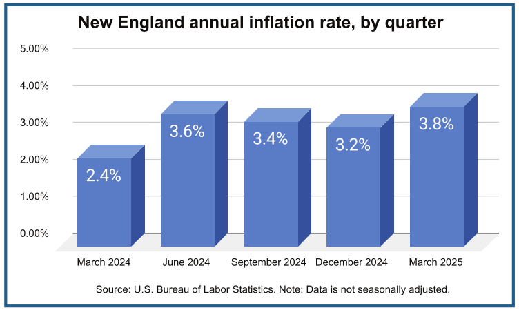 Meanwhile, prices climbed. The average New England annual inflation rate for the past three months was 3.8%, the highest of the previous five quarters. But that average belies the number for the month of March, which came in at an annual rate of 3.2%.