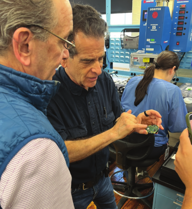 DEKA president Dean Kamen, right, who invented the first portable insulin pump in the 1970s, talks about the technology of its successor, twiist, with Alan Lotvin, CEO of Sequel Med Tech, the company created to develop and market the new product, which is being manufactured in Manchester. (Photo by Mike Cote)