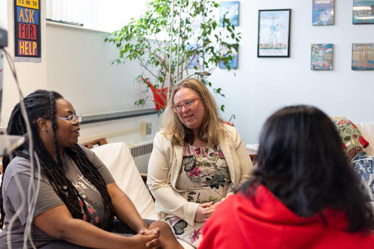 Ann Goodrich-Bazan, director of career education in the Lloyd and Helen Ament Astmann ‘69 Career Center at Franklin Pierce University, speaks with senior Ja’hid Anderson, left, and recent graduate Ked Prukmathakul, right, in the university’s Student Success Center. (Photo by Hannah Schroeder, Keene Sentinel) When Bailey Saddlemire, Class of ’22, was a student at Keene State College, she considered moving out west to California.