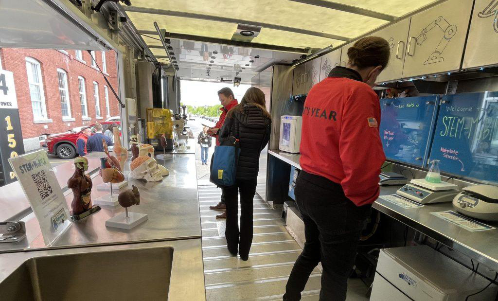 Attendees of the ReGen Valley Tech Hub Community Update Friday tour the STEM-Mobile, a traveling lab that introduces the biofabrication industry to schools and communities across New Hampshire. (Photo by Maureen Milliken)
