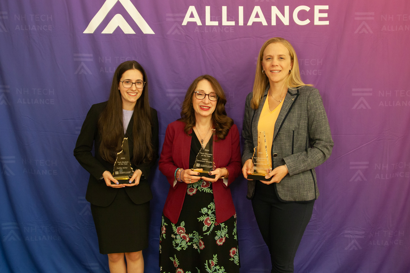 Caitlin Seiler, Jessica Carcerano-Wheeler and Rebecca Woods display their awards for Tech Student of the Year; Educator of the Year; and Tech Professional of the Year at NH Tech Alliance’s 2025 TechWomen Connect and Awards, held at Fidelity Investments in Merrimack on May 28.