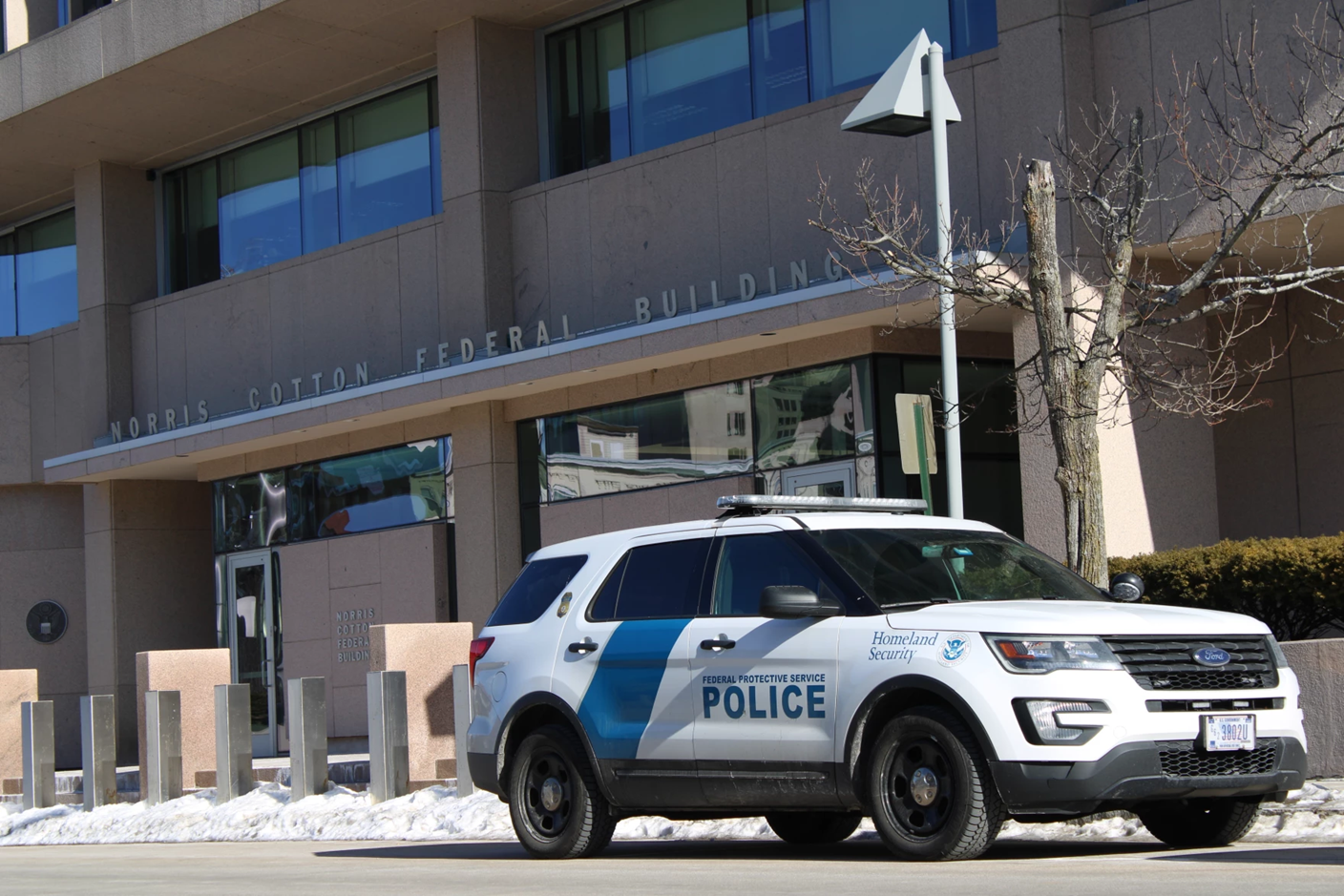 A Homeland Security cruiser at the Norris Cotton federal building in downtown Manchester, the site of a field office for Immigration and Customs Enforcement, on Jan. 28, 2025. (Photo by Lau Guzmán, NHPR)