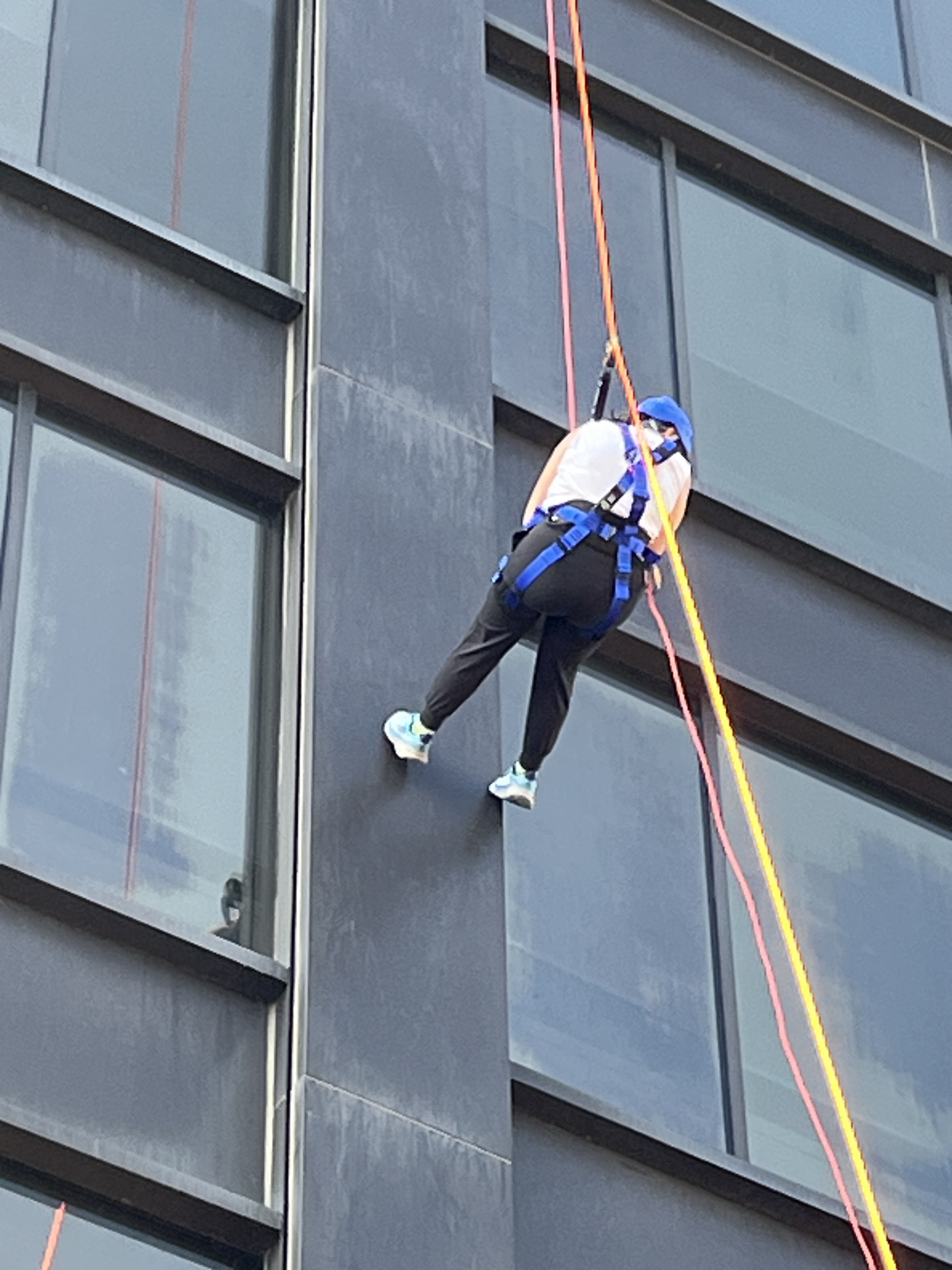 Heidi Cloutier wanted to raise money to pay for food and activities that her university program doesn’t provide, so she braved 95-degree heat to rappel down the south side of the Brady Sullivan Plaza, a 24-story tower in downtown Manchester.