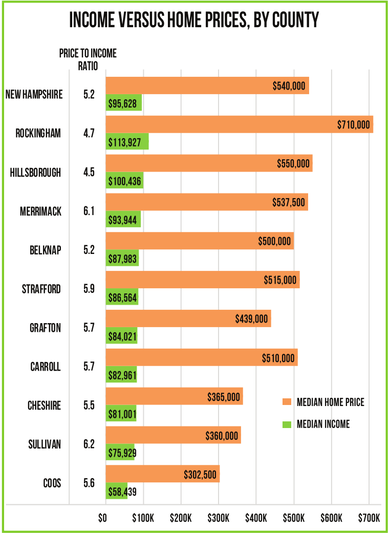 Household incomes haven’t grown at the same rate as home prices here in New Hampshire. As a result of this growing disconnect, the price-to-income ratio in each of the state’s 10 counties is one and a half to two times what it should be.