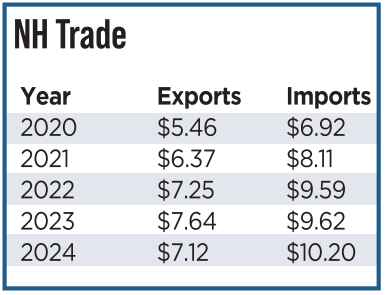 New Hampshire’s top exports are aircraft related. The Granite State exported $1.63 billion in that category last year, about 23% of all exports.