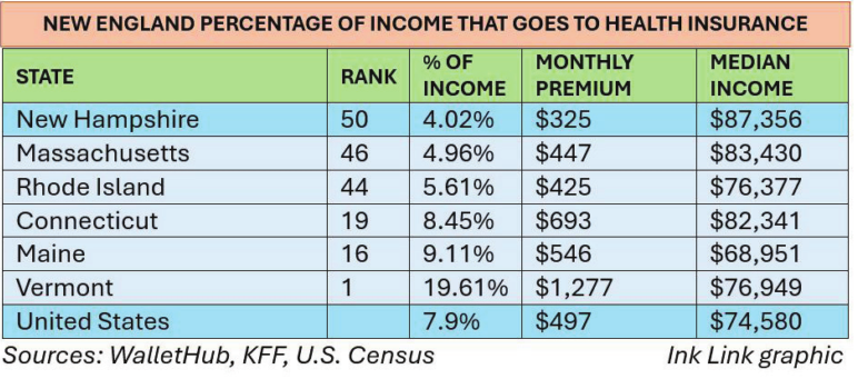 Residents of neighboring Vermont, according to the study, use the highest percentage of their income for health insurance: 19.61%. Vermont’s median income is $76,949 and the average benchmark premium is $1,277, the highest in the nation.