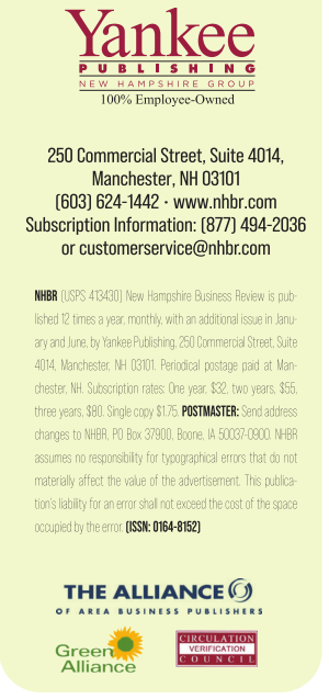 NHBR (USPS 413430) New Hampshire Business Review is published 12 times a year, monthly, with an additional issue in January and June, by Yankee Publishing, 250 Commercial Street, Suite 4014, Manchester, NH 03101. Periodical postage paid at Manchester, NH. Subscription rates: One year, $32, two years, $55, three years, $80. Single copy $1.75. POSTMASTER: Send address changes to NHBR, PO Box 37900, Boone, IA 50037-0900. NHBR assumes no responsibility for typographical errors that do not materially affect the value of the advertisement. This publication’s liability for an error shall not exceed the cost of the space occupied by the error. (ISSN: 0164-8152)