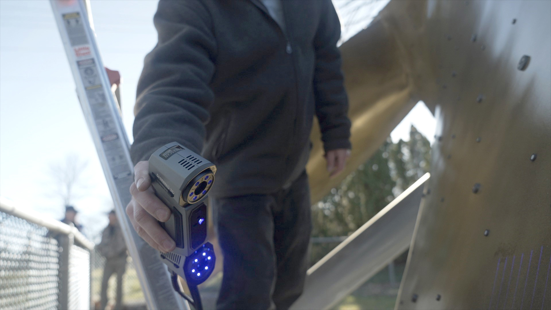 True Prop’s handheld 3D scanners use a grid of blue-light lasers to plot the surface of a propeller that was previously on the USS Albacore. (Photo by Dan Freund)