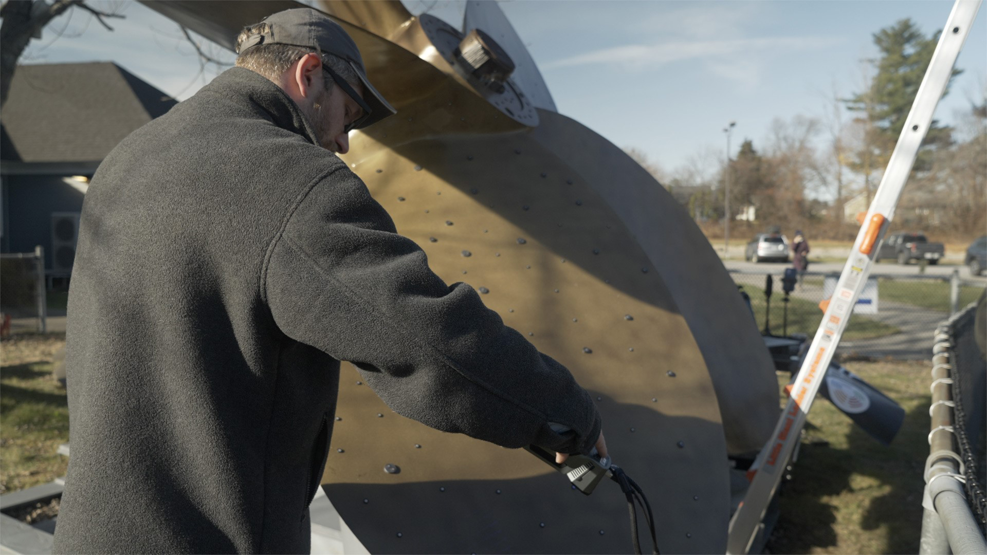 Adam Kaplan, chief technical officer of TrueProp, scans the surface of the USS Albacore’s former propeller to locate any damage. (Photo by Dan Freund)