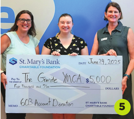 5. Each year, St. Mary’s Bank selects four nonprofit organizations, one in each of the categories of children and families, food and shelter, animals, and environment, to receive a donation as part of their 603 Account program. This year, The Granite YMCA received a $5,000 donation as the selected children and families nonprofit. Pictured, left to right: Jessica Riendeau, director of philanthropy, Granite YMCA; Kelsea Batchelder, community and employee engagement specialist, St. Mary’s Bank; and Michele Sheppard, CEO, Granite YMCA.
